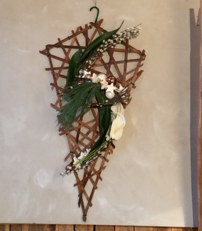 • Pour le centre de table, prévoir : un cercle en fer - du grillage de cuivre - dupapier celo frais afin de recouvrir le grillage - des pommes de pain à coller à la colle chaude sur la structure grillage +celo - une bande de polypropylène... (rayon bricolage pour faire abats jour ) - des étoiles à recouvrir de laine - des boules de Noël à utiliser comme réserve à eau pour les fleurs ou des tubes à orchidées recouverts de feuillages pour une période hors Noël.