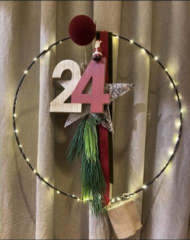 Un cercle, une guirlande led à piles, pistolet à colle et colle, ficelle, rubans, boule de Noël, étoile taillée dans une écorce, mini branche de conifère, message de Noêl en bois…