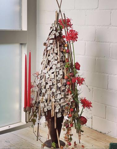 Un arbre de Noël de Bearchsquares … Des timbres de bois qui apportent profondeur et rythme. Une décoration pour la période de l'avent avec quelque fleurs coupées qui peuvent facilement changer.