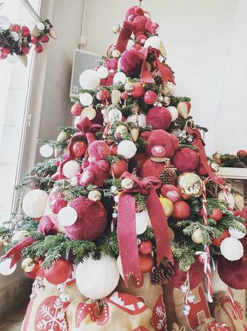 Sapin tradition habillé de rouge. Cachette à nounours.