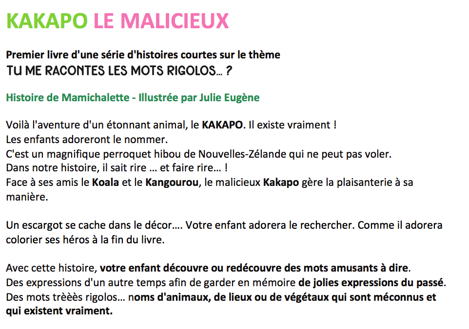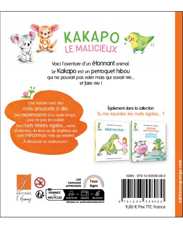 Synthèse : Kakapo, koala, Kangourou et plaisanteries entre amis … Livre jeunesse. Histoire courte avec des mots rigolos, bizarres, cocasses …. Des mots retenus pour le rythme des syllabes. Amusant à dire… !Ces sont des mots familiers, des noms d'animaux, de lieux, de végétaux ou des expressions du passé.Explication des mots en fin de chaque histoire pour Lire - partager - apprendre.